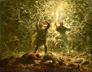 ミレーは労働にいそしむ農民の姿を共感をもって描いた「農民画家」と見なされているが、農民の絵だけを描いたわけではない。ミレー最後の作品(絶筆)は「深夜の野鳩狩り」である。野鳩は当時の人々にとって大変なご馳走だった。(今もフランスではそうらしい)。
