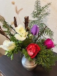 毎日雪が少しずつ降っています。これくらいの雪がいいなあ。真冬こそ花が欲しい。幸い冬でもグリーンが鮮やかなフッキソウとヤブランが雪の下にあります。樅の枝もきれい。それらと原村で栽培が盛んなアネモネを買ってきて生けました。アネモネは冬の花、これから2ヶ月くらいは安く出回ります。8本で350円でした。